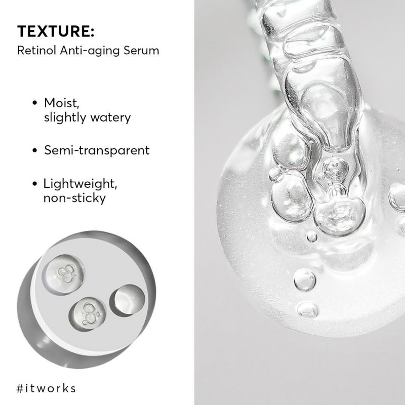 ரெட்டினோலின் (பாஸ்போலிப்பிட்கள்) சிறப்பு விநியோக முறைக்கு நன்றி, சீரம் தோல் மேற்பரப்பை எரிச்சலூட்டாமல் சருமத்தின் ஆழமான அடுக்குகளில் செயல்படுகிறது. இதனால்தான் தயாரிப்பு தோல் மீது அதன் மென்மையான செயல்பாட்டால் வகைப்படுத்தப்படுகிறது.