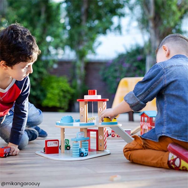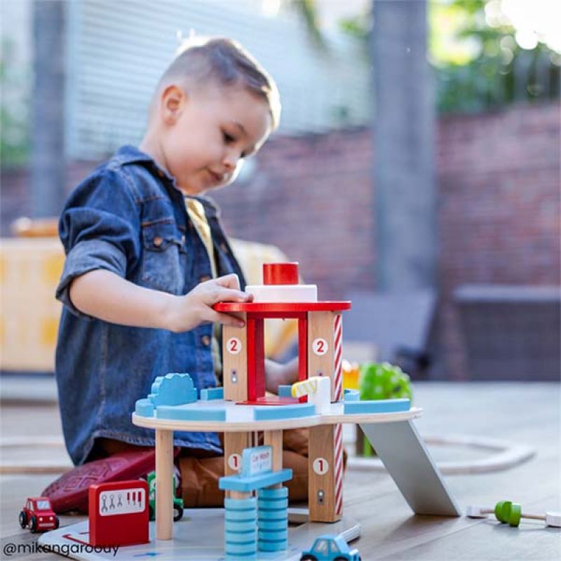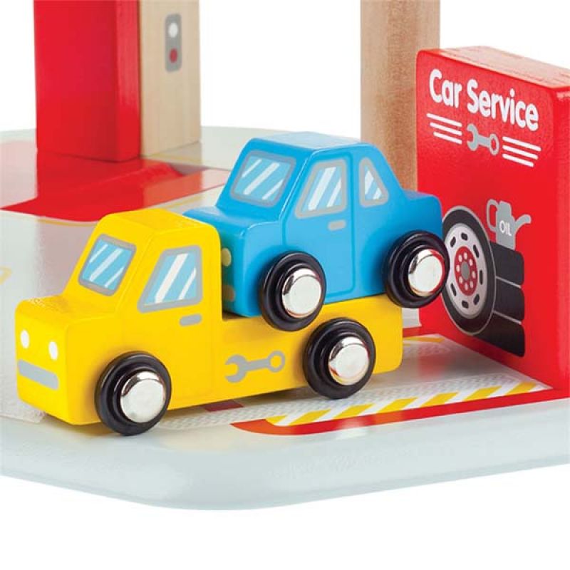 Car mad youngsters will love this mighty hub of activity! Open the parking barrier and whizz down the ramp back to the lower level and head for home! Don't forget to clean your car and fill it up with petrol before you go. This colourful garage has everything your little one needs to help them get from A to B. The Garage Playset includes: 3 Vehicles Tow truck Handy Carwash Petrol Pump Service Bay And a wind up car lift, which makes a 'click' noise, to take cars to the upper level car parking. The vehicles are also compatible with leading wooden track systems. A great way to encourage creative and imaginative play. Develops hand/eye coordination, fine motor skills and dexterity. Requires adult assembly. Age: 3 Years+ Dimensions: 28.5 x 37 x 50cm Made from high quality, responsibly sourced materials. Conforms to current European safety standards.