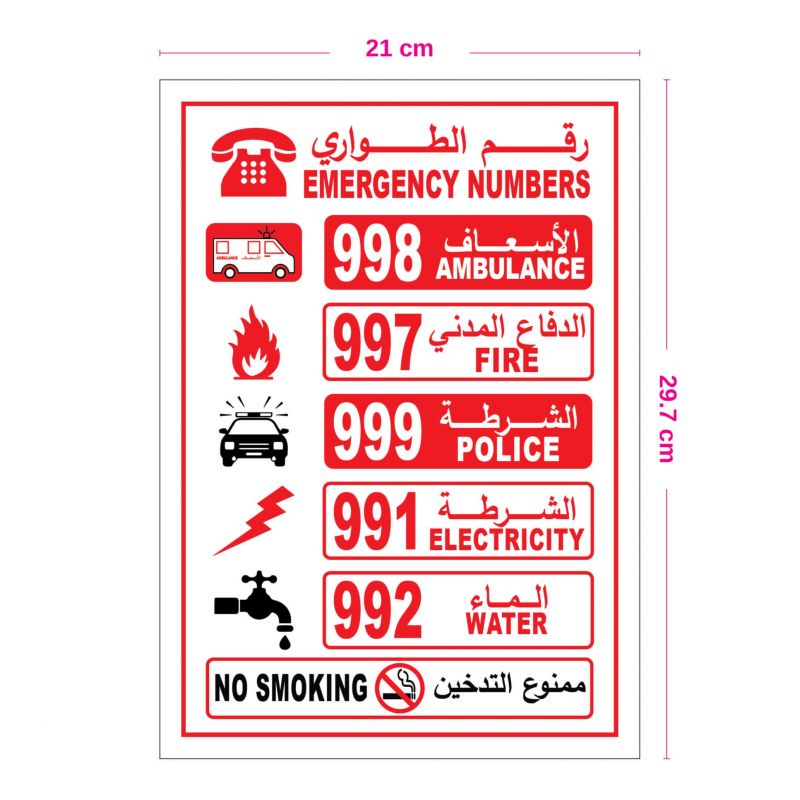 Stay prepared and informed with the UAE Emergency Numbers Sign (A4 Vinyl Sticker Set of 4) — an essential safety communication tool for every workplace, home, or public space. Designed to display the official UAE emergency and helpline contact numbers, this clear and vibrant sticker ensures quick access to vital information during critical situations.