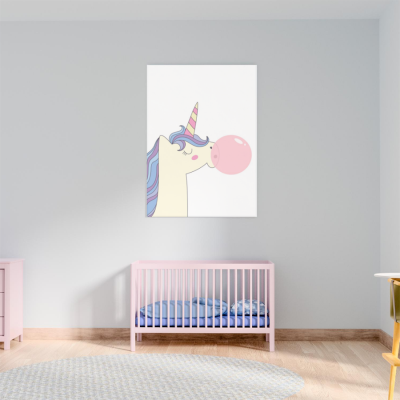 This adroable wall art print features a magical unicorn blowing a giant bubblegum bubble. This living room wall art has a soft, pastel color palette with a dreamy, ethereal quality. The design is perfect for any little girl's room or anyone who loves unicorns and all things magical. The wall art decor print is high quality and made with archival inks, ensuring it will last for years to come. Yes, this wall art is a perfect addition to any room that needs a touch of magic and wonder. Adorable and playful artwork featuring a unicorn blowing bubble gum High-quality print on premium paper for long-lasting durability Perfect for a child's bedroom or playroom Adds a touch of magic and fantasy to any space